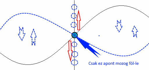 Egyszerű szinuszos transzverzális haladó hullám.A kék pötty harmonikus rezgőmozgást végez, de nem halad. Ez a hullám tekinthető különböző fázisban harmonikus rezgőmozgást végző pontok sorának, ahol csak a hullámfront halad, de az egyes részecskék nem.